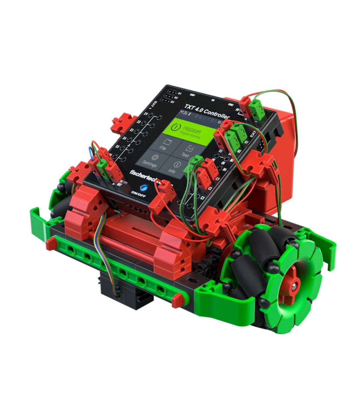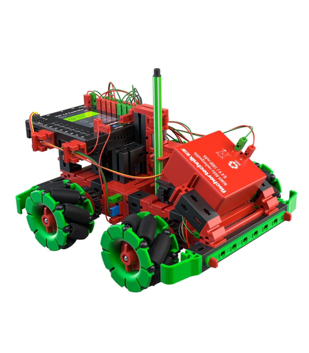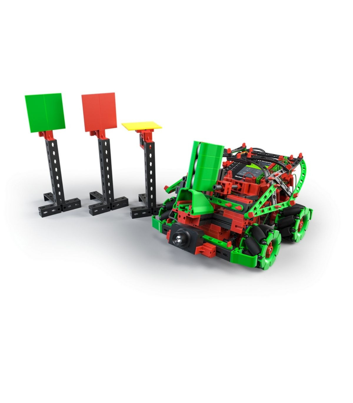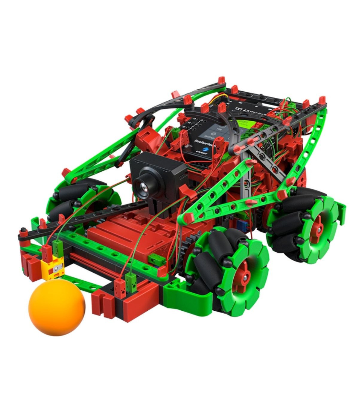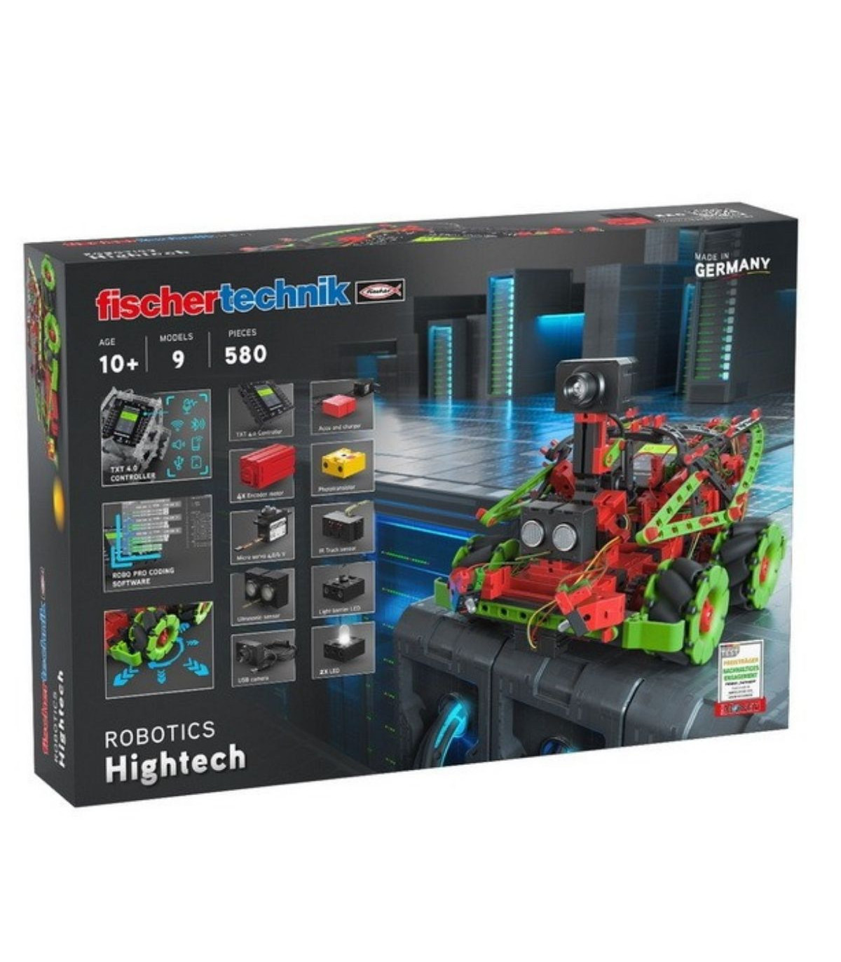 ¡Programa como los profesionales con Robotics Hightech de fischertechnik! 9 emocionantes modelos están esperando a ser montados y programados. Los modelos de iniciación ofrecen una introducción fácilmente comprensible al mundo de la robótica y la programación. Aquel que ya posea conocimientos avanzados, puede empezar con los modelos de diseño superior, como el robot pintor o el robot que dispara. ¡Un elemento destacado de este kit de construcción son las ruedas omnidireccionales, accionadas por cuatro motores codificadores, que permiten un movimiento en cualquier dirección! También se incluye nuestra cámara con procesamiento de imágenes con la que, por ejemplo, un robot futbolista puede reconocer una pelota: ¡chuta y gol! El nuevo controlador fischertechnik TXT 4.0 ofrece numerosas características nuevas con el nuevo software de programación ROBO Pro Coding. Además de la programación gráfica en un entorno Blockly, ahora también es posible programar a través de Python. El software no depende del sistema operativo y puede utilizarse en dispositivos móviles. A modo de actuadores y sensores adicionales, el kit de construcción incluye un servomotor, un sensor de pista por infrarrojos y un sensor de distancia por ultrasonido.