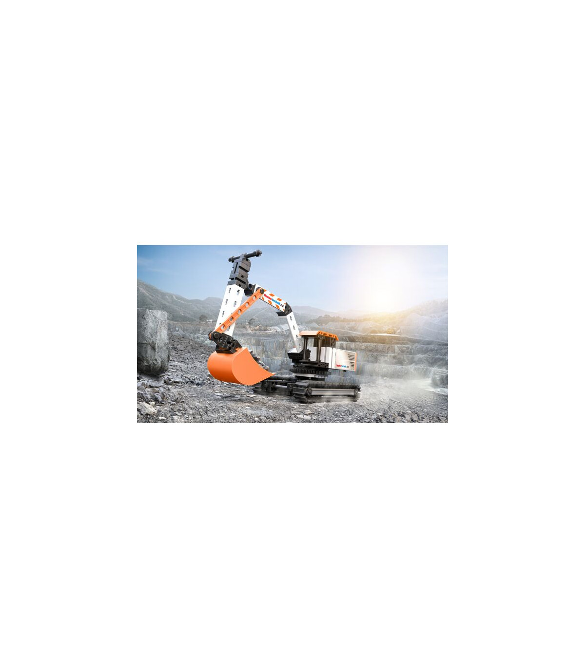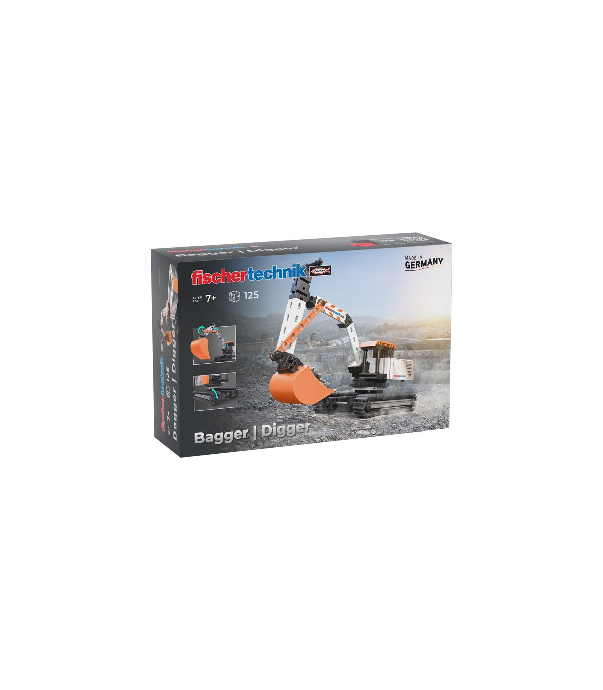 Las detalladas secuencias de movimiento y la típica combinación de colores fischertechnik convierten a la excavadora en el centro de atención de cualquier obra